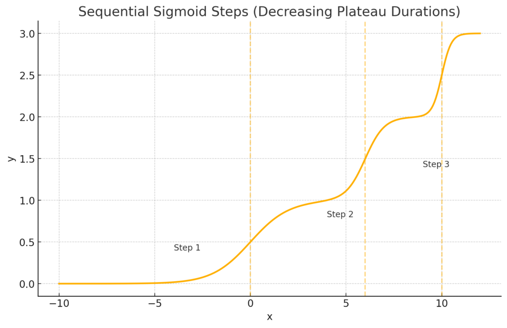 シグモイド曲線については前述したが、大抵の場合、一つのシグモイド曲線がプラトーを迎えても、何らかのパラダイムシフトが起きて次のシグモイド曲線が始まる(図15)。それは人類史が経験して来たことだ。
