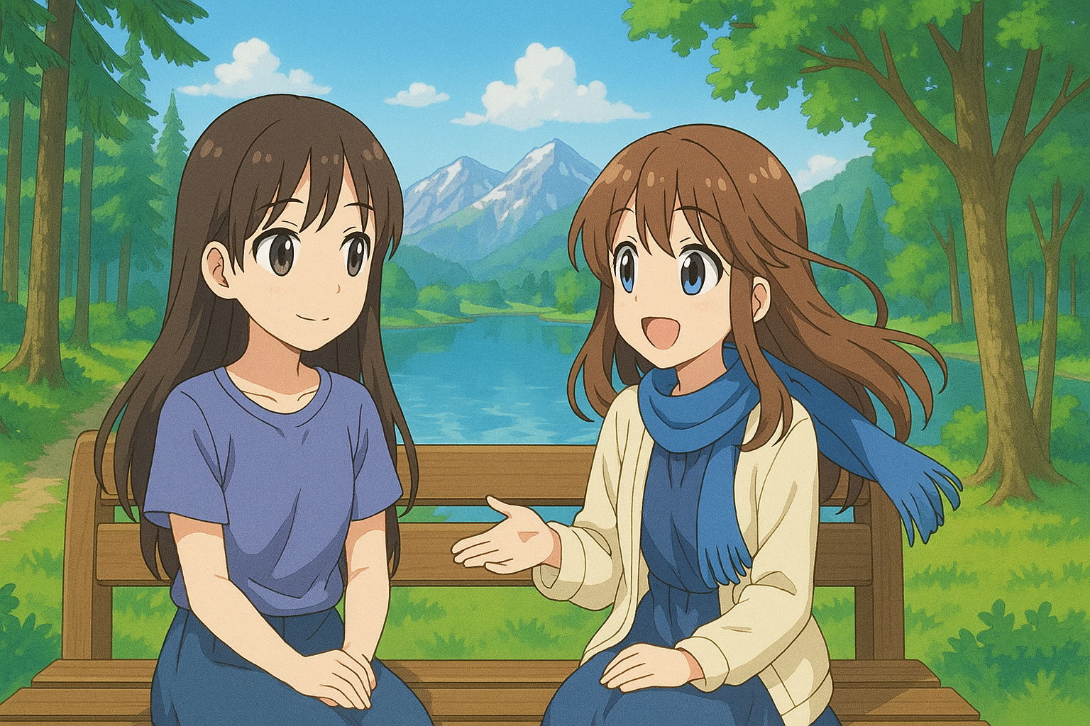 (あなたは静かな公園のベンチに座っている。やわらかな秋風が木々を揺らし、黄色く染まった葉がはらはらと舞い落ちてくる。空は高く澄み渡り、遠くで子供たちの笑い声が響いている。そんな穏やかな景色の中、ベンチの隣にひとりの少女が座っている。)
