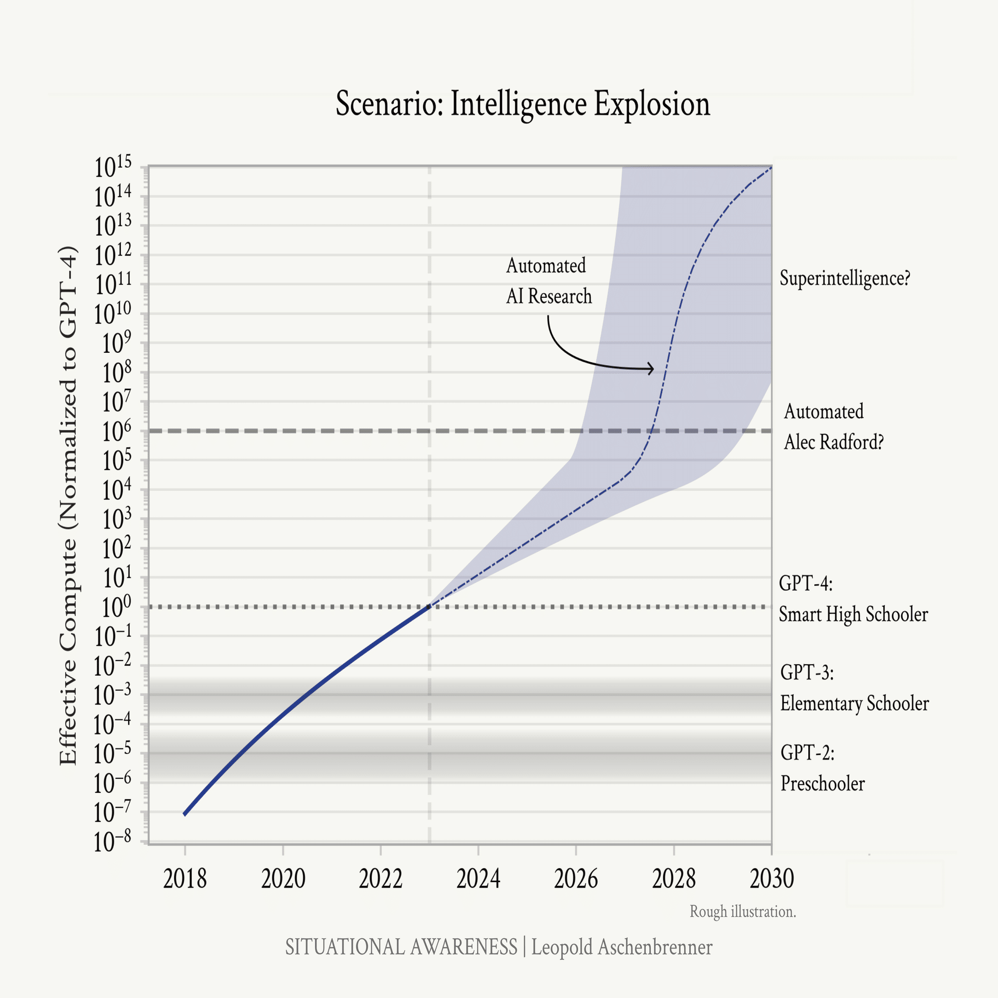 これをよく表した図が、あの有名なアッシェンブレナー氏の論考『Situational Awareness』の象徴的なグラフだ。以下に引用転載する。