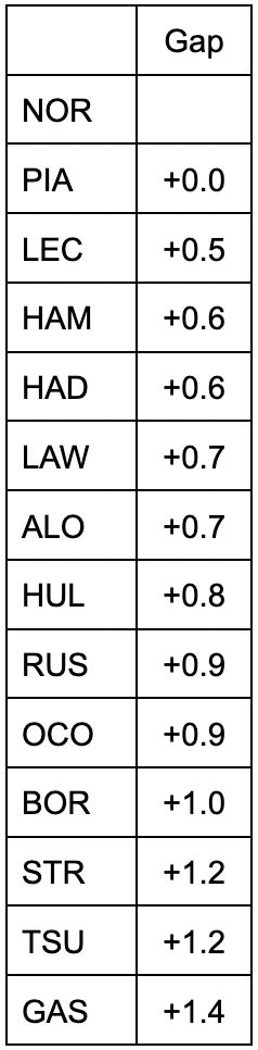 また、クリア・ダーティエアやスティントの長さ、プッシュするインセンティブなどのレース文脈も考慮している。また、スティントの始めに飛ばした際に後のペースに与える悪影響、ゆっくり入った場合の好影響についても加味した。定量的に導出できないドライバーについては結論を出さず、信頼できる数字のみを公開する方針としている。