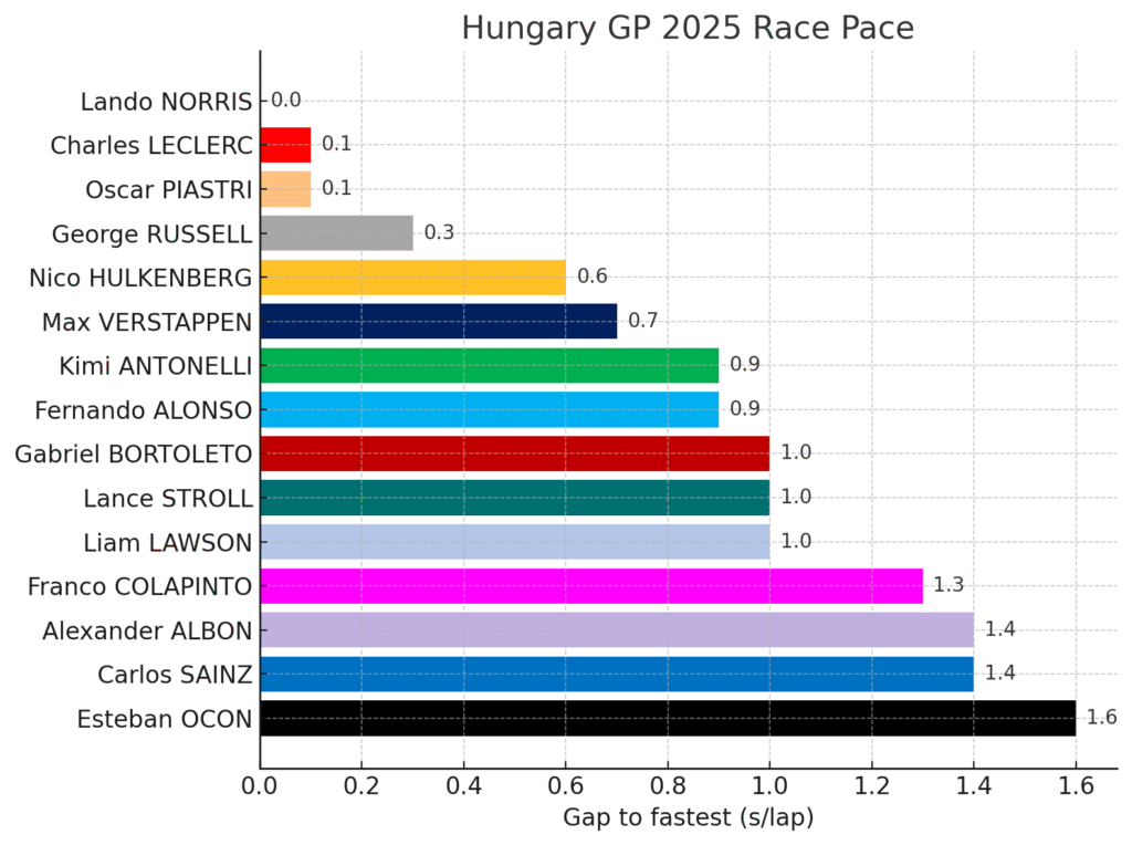 ※8/9修正:ルクレールの値を0.1秒下方修正。第1スティントでピアストリと互角かやや速く、第2スティントは1周新しいタイヤで2秒弱の差で追走されており、僅差ではあるが劣勢。GPT-5と再度ディスカッションした結果、0.1秒下に修正することとした。