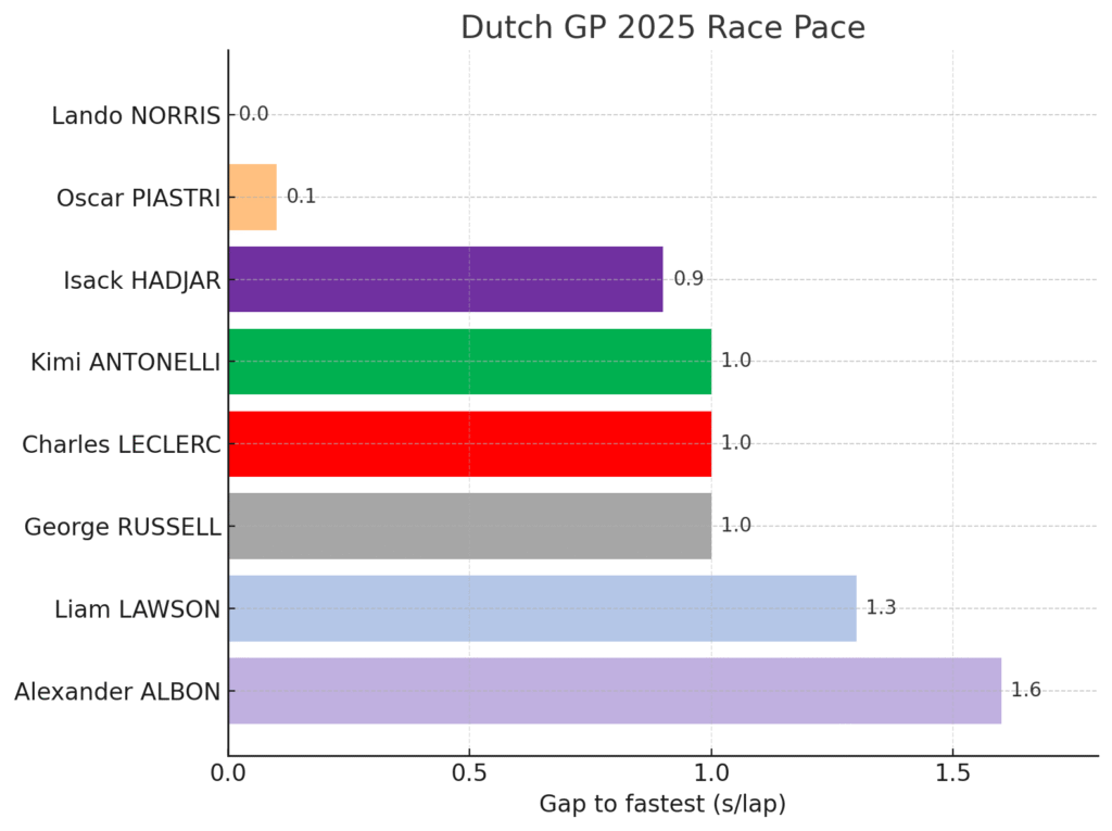• Piastriを基準に取った第2スティントの各比較へ**+0.328 s/周**を一律で戻し、実力差に整合させた。