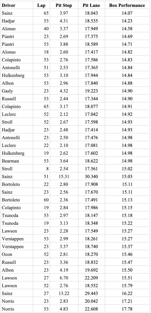を計算し、ドライバー達の停止と発進のパフォーマンスを数値化することを試みる。当サイトではこのタイムを「ボックスパフォーマンス」と定義する。