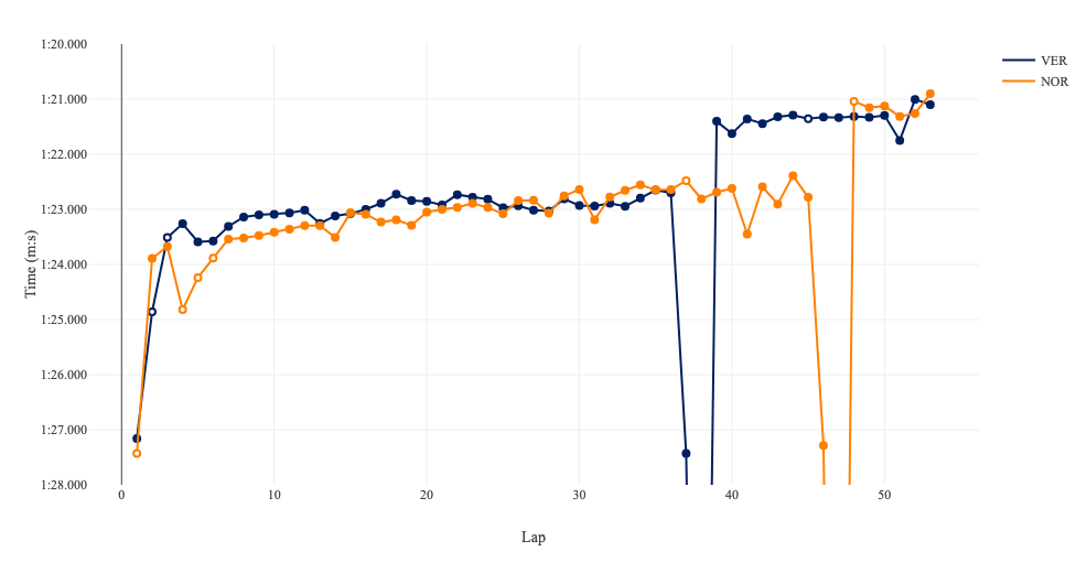 ノリスのピットでは左フロントの遅れが発生し、5.9秒というスローストップに。ピアストリが先にコースへ戻り、順位が入れ替わった。