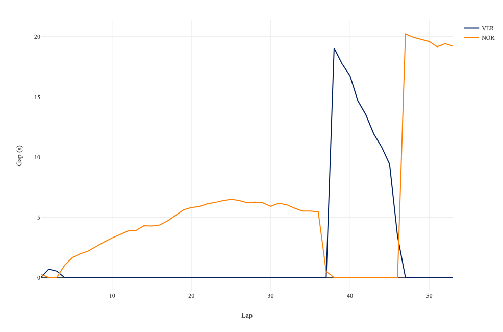 彼らが狙ったのはセーフティカー/VSC下のピットロス短縮効果。この状況下ではピットロスが通常時の約24秒から約15秒に縮む。つまり、フェルスタッペンがその15秒圏内に入ってくる前にSCやVSCが出れば、ノリスが首位を保ったままピットを済ませられる。