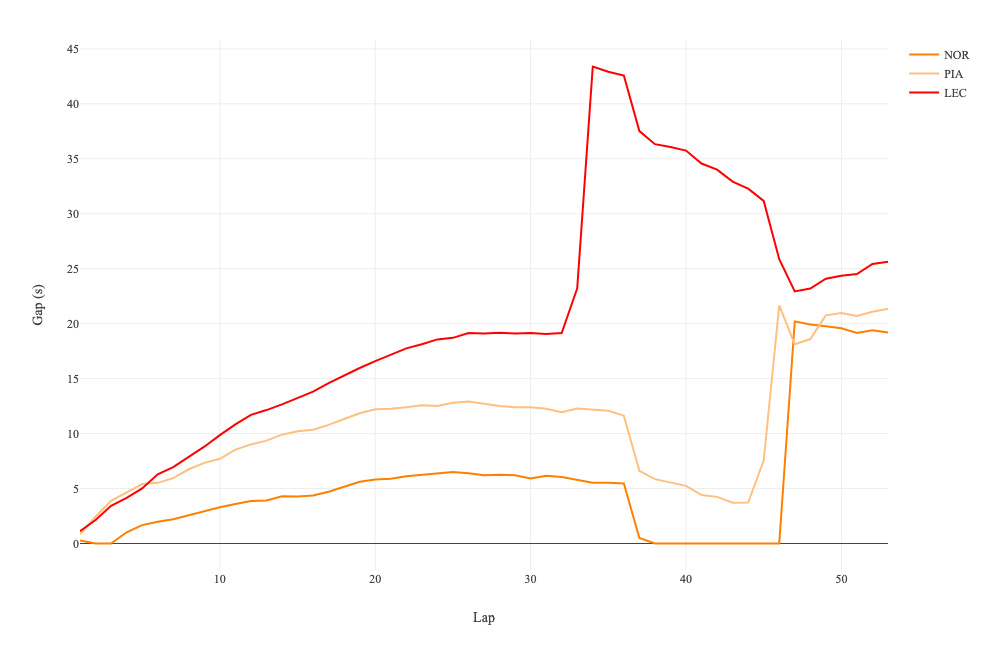 そして図3に示す通り、後方のルクレールの追い上げも視野に入れて、脅威になる前にピアストリを先に入れるというリスクマネジメントも適切だった。
