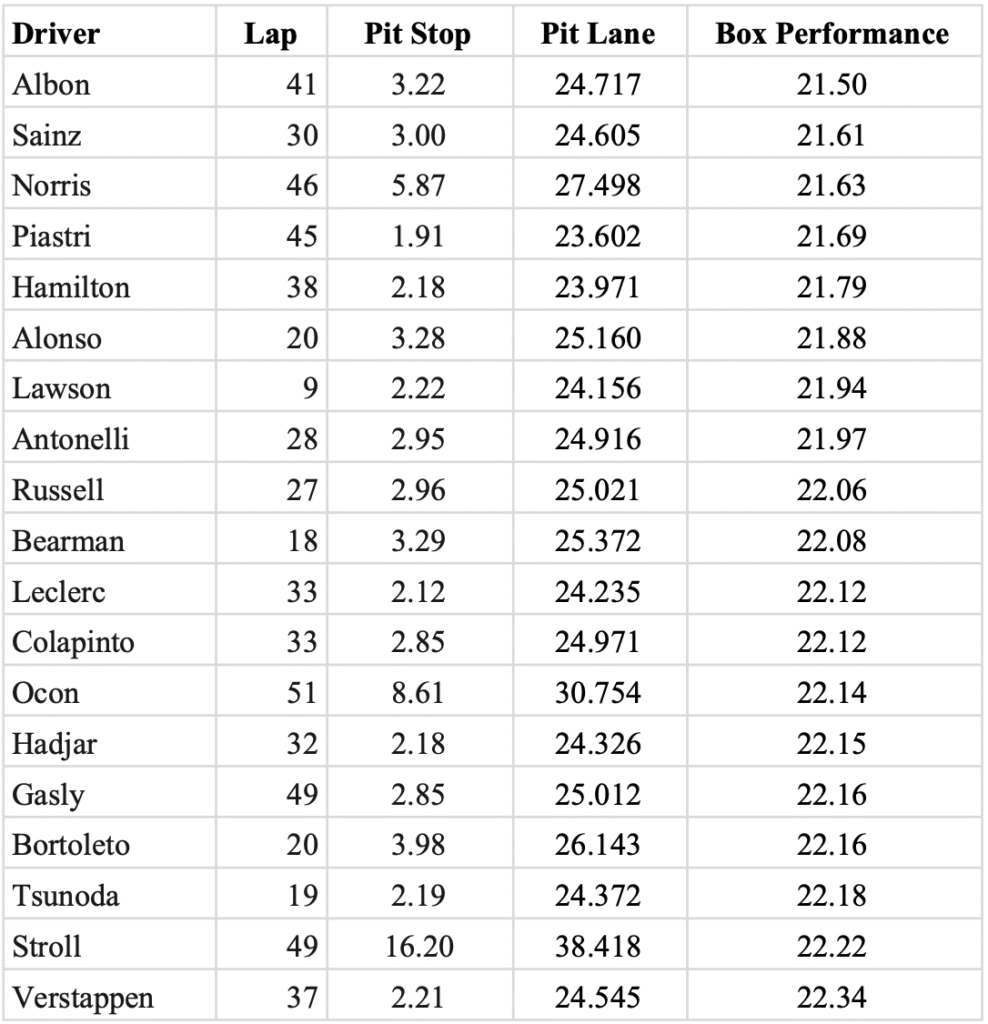 を計算し、ドライバー達の停止と発進のパフォーマンスを数値化することを試みる。当サイトではこのタイムを「ボックスパフォーマンス」と定義する。