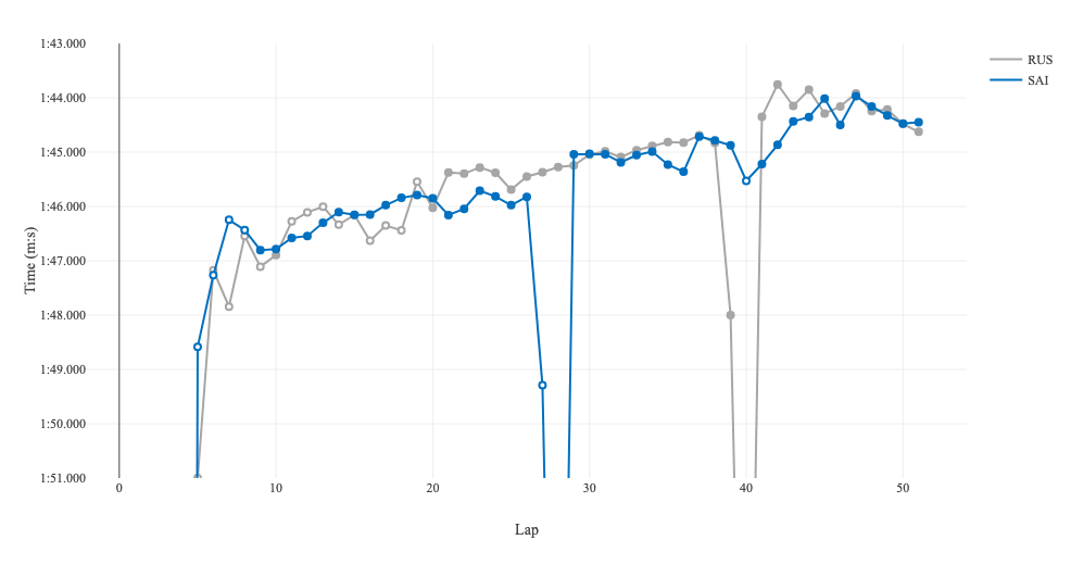 サインツはミディアムタイヤで27周目まで引っ張ったが、その時、ハードタイヤスタートのラッセルは2.1秒差まで迫っていた。そしてここからラッセルは、27周古いタイヤであるにも関わらず、サインツを平均0.105秒上回るペースで周回を重ねた。
