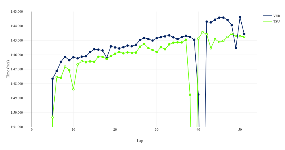 予選では雨と風が絡む中フェルスタッペンに1秒以上の差をつけられてしまった角田。しかし、レースペースは非常に良かった。図3にフェルスタッペンと比較する形で示す。