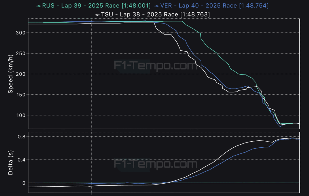 さらに、ラッセルはインラップが1:48.001と異常に速く、これは同時期にピットストップを行ったフェルスタッペンや角田よりも0.7秒以上速い。そして驚くべきことに、このタイムの殆どがピットレーン進入時のレイトブレーキングによるものだ。図2にそのテレメトリデータを示す。