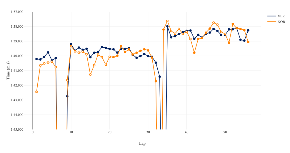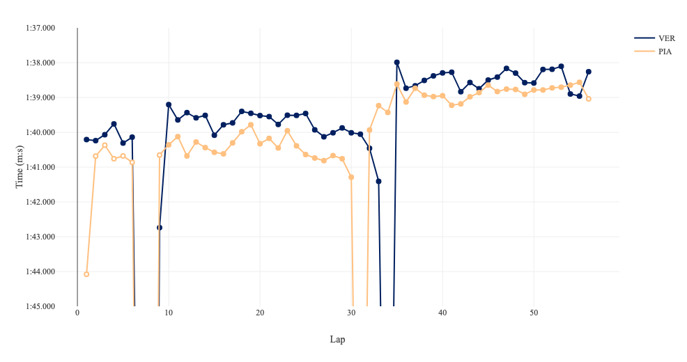 図2にフェルスタッペンとピアストリのレースペースを示す。