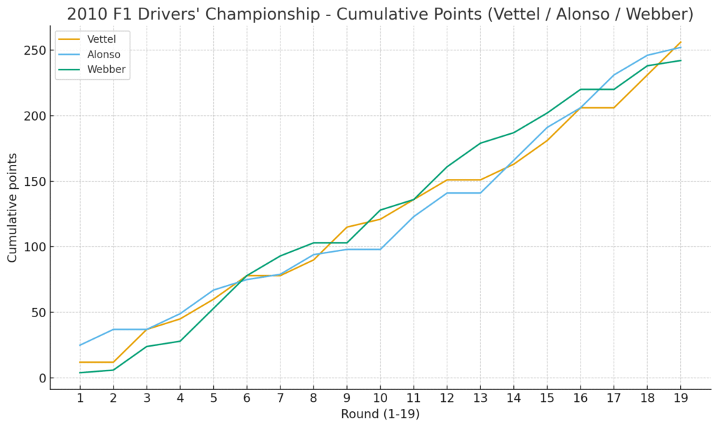 この一連のピアストリの複数の側面での不調から思い起こすのは、2010年のウェバーだ。図3に2010年のタイトル争いのポイントの推移を示す。