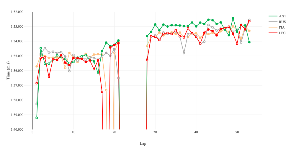 図1にアントネッリ、ラッセル、ピアストリ、ルクレールのレースペースを示す。