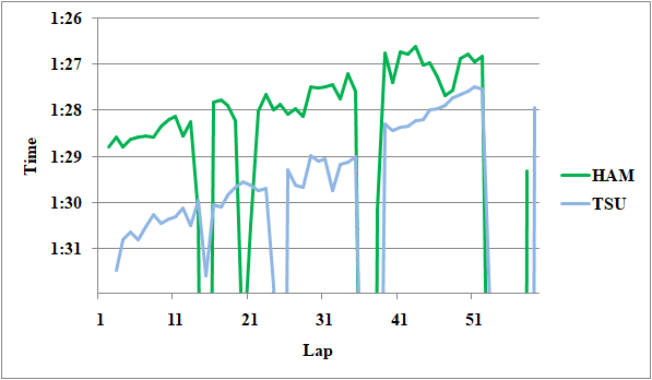 ちなみに第1スティントはダーティエアの影響もあるため、評価しづらいが、同じような数値と考えられ、頷ける。
