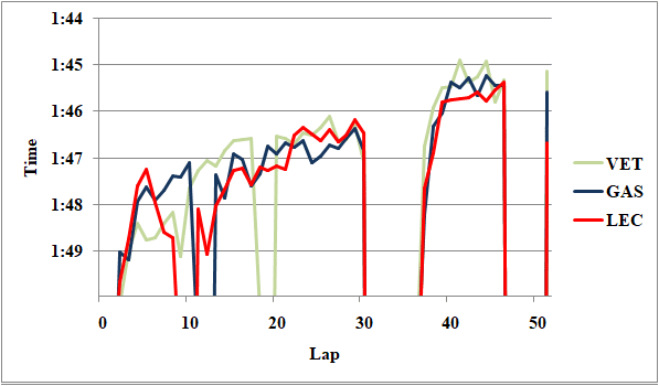 予選で11番手だったベッテルは新品ソフトを履いてスタート。ライバル勢より10周前後も引っ張り角田をオーバーカットした。第2スティント以降も好調で、上位勢の波乱もあり、見事2位表彰台を獲得した。以下にベッテルとガスリー、ルクレールのレースペースを示す。