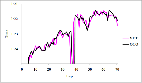 そして5つ目は第1スティントのペースマネジメントだ。図1にオコンとベッテルのレースペースを示す。